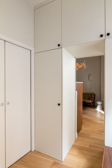 Les rangements ont été optimisés pour tirer le meilleur parti de ce petit appartement et en améliorer la fonctionnalité.