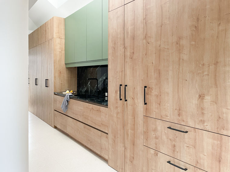 Rénovation de la pièce de vie de cette maison familiale. L’objectif était de créer un fil conducteur entre l’entrée, la cuisine et la salle à manger, disposées en longueur. Le vert du papier peint fait écho à celui de la pierre verte des Alpes utilisée dans la cuisine.